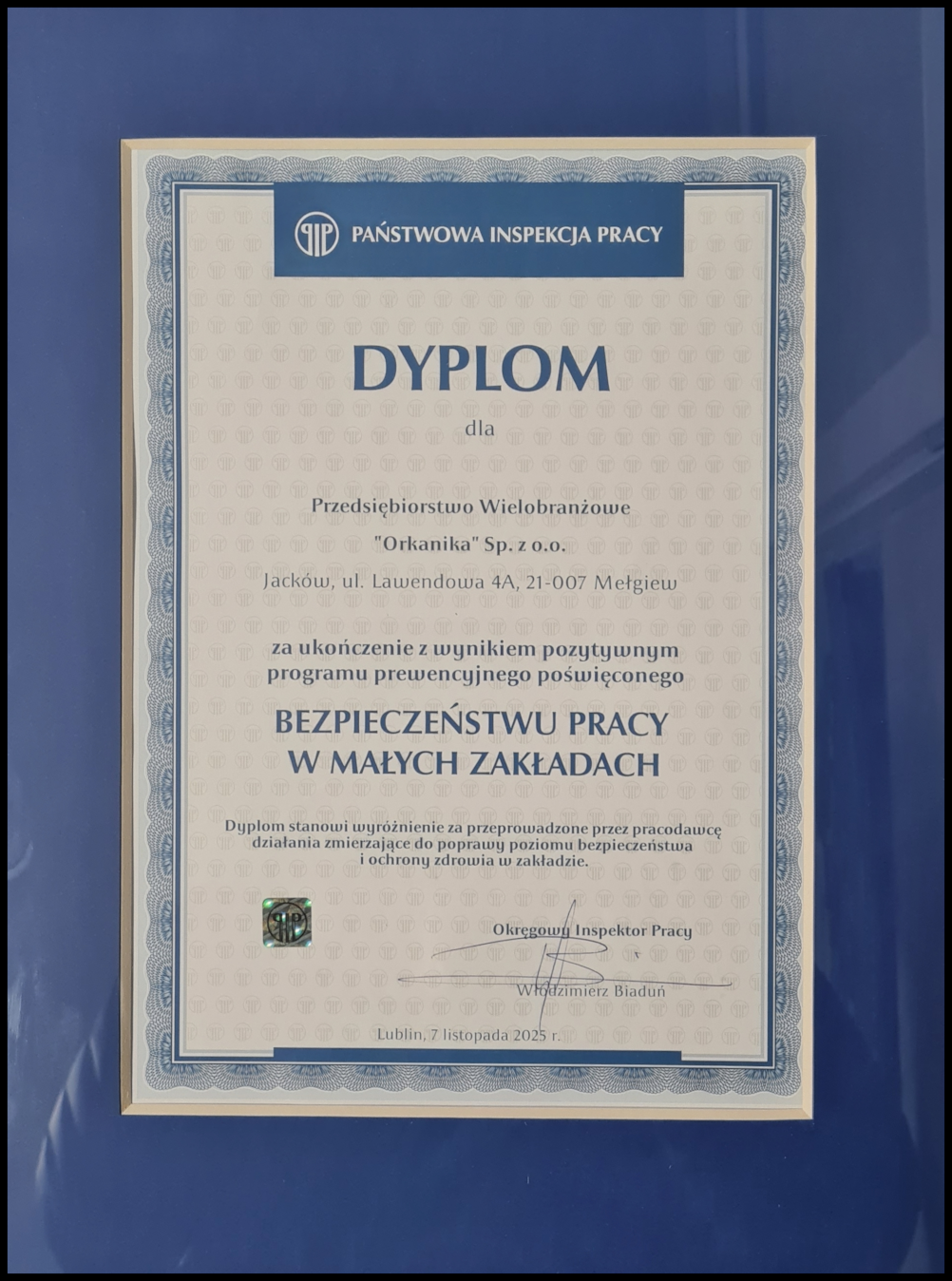 7 listopada 2025 r. firma Orkanika Sp. z o.o. oficjalnie odebrała wyróżnienie Państwowej Inspekcji Pracy za pozytywne ukończenie programu prewencyjnego „Bezpieczeństwo pracy w małych zakładach”.